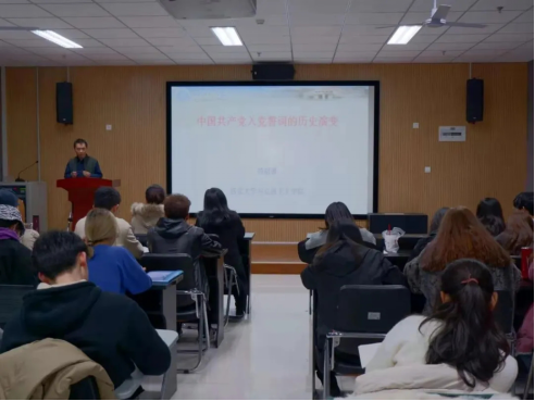 按照艺术学院青年马克思主义者培养工程第二期大学生骨干培训班培养方案要求和学院团委工作安排,12月2日晚,本期青马班首场理论报告于长安校区东学楼北1401室圆满举办,马克思主义学院苟昭赟副教授以《中国共产党入党誓词的历史演变》为题,为学员们带来一场精彩的精神盛宴。学院党委副书记徐茜老师,本期青马班全体学员、本学期新发展团员以及入党积极分子一同参加。此次报告会由学院团委书记白鹤老师主持。
