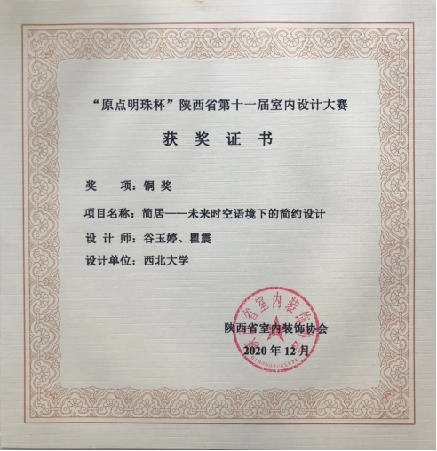 南康老师指导的作品“简居—未来时空语境下的简约设计”“沣东新城办公综合体智慧谷景观设计”分别获得学生组铜奖和优秀奖,钱江老师和陆宝新老师指导的作品“慢步校园—西北大学对外交流中心周边景观设计”获得学生组优秀奖。另外,南康老师指导的作品“西安灞河大道景观设计”“有间便利店”成功入围,朱尽艳老师指导的作品“幸福之家—昆山巴城镇临湖景苑80平米房改造”“100平现代简约风—热情似火温润如玉”成功入围。