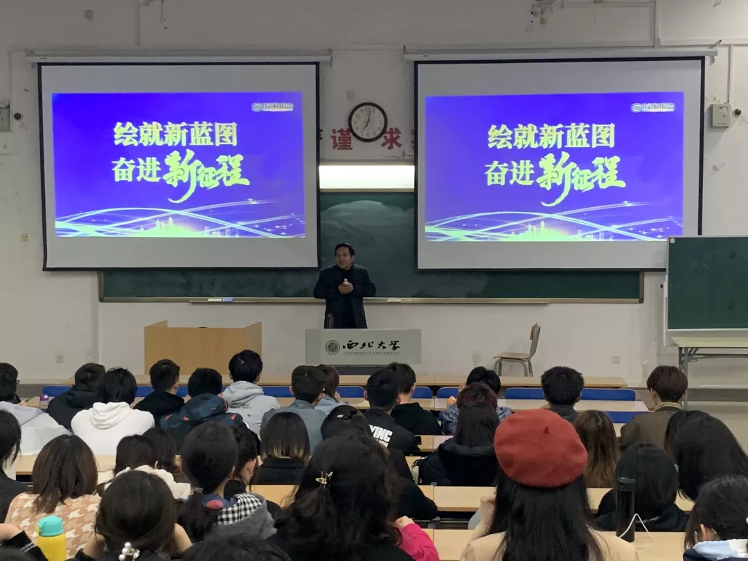 为深入贯彻落实全国高校思想政治工作会议精神,教育和引导学生全面准确的理解在历史的新起点上,党的路线、方针与政策,帮助青年学生深刻认识全面建成小康社会重大意义和未来所肩负的历史使命,4月27日,马克思主义学院曹建军教授应邀于长安校区1J301教室开设“绘就新蓝图 奋进新征程”专题形势与政策课,学院辅导员宋培源以及2020级全体本科生参加。