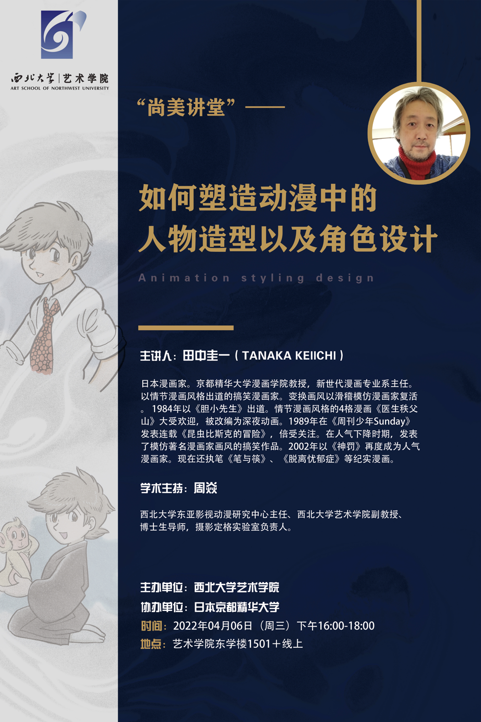 2022年4月6日,由西北大学艺术学院联合日本京都精华大学漫画学院(新世代漫画专业),举办的“动漫角色设计塑造”专题讲座与实验课程,在长安校区艺术学院东学楼1501举行。
