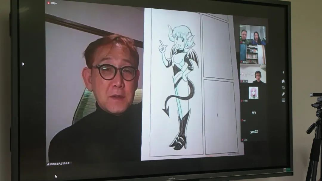 讲座与实验课程采用线上线下相结合的方式,围绕如何塑造动漫中的人物造型以及角色设计展开研讨。其间由日本著名漫画家、现任京都精华大学漫画学院教授,新世代漫画专业系主任田中圭一(TANAKA KEIICHI)主讲,京都精华大学韩国籍教授姜竣副讲、吴鸿老师访谈的形式展开。学术主持由西北大学东亚影视动漫研究中心主任、艺术学院副教授周焱担任。艺术学院副院长王江鹏出席了本次活动。参加活动的还有,19、20级动画专业及跨媒体方向研究生四十余人。