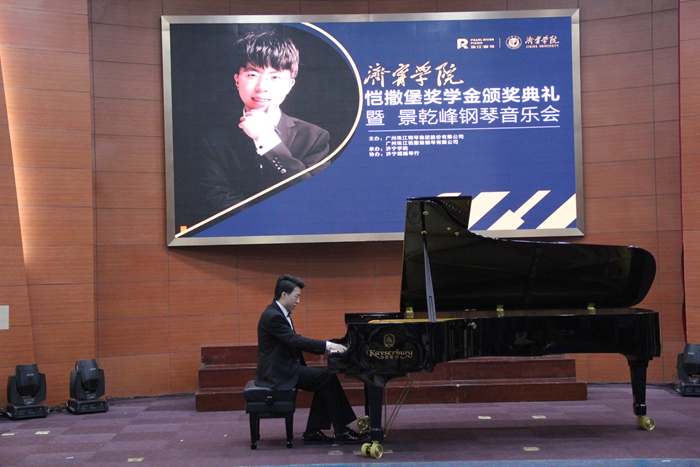 1月8日下午2:30,济宁学院珠江·恺撒堡奖学金颁奖仪式暨景乾峰钢琴音乐会在理科楼报告厅举行。校党委副书记马恩、珠江钢琴集团广州珠江恺撒堡钢琴有限公司营销中心总监袁海浪先生分别在颁奖仪式上致辞,并为获得一等奖的同学颁奖。音乐系主任葛修路和钢琴教研室全体教师,分别为获得二、三等奖的同学颁奖。2015级音乐学张艺婉同学作为获奖代表发言。接下来,恺撒堡未来艺术家景乾峰钢琴音乐会正式开始。