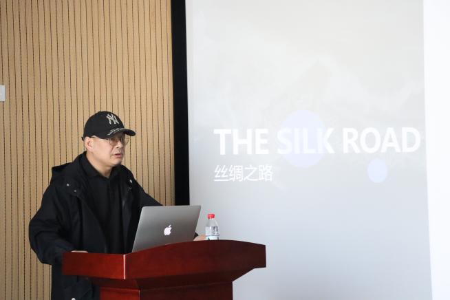 首先,金冈先生对讲座主题“丝绸之路”的含义与精神进行了概括,提出和平合作、开放包容、互学互鉴、互利共赢、共商、共建、共享七个关键词,指出这也是他策展工作所围绕的核心思想。并对策展人的定义及其应具备的素质与责任进行阐述。