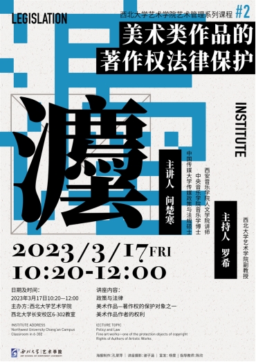 3月17日上午,西北大学艺术学院艺术管理系列课程讲座第二讲《美术类作品的著作权法律保护》在西北大学长安校区6-302教室举行。本次讲座邀请到中央音乐学院音乐学博士、中国传媒大学传媒政策与法规硕士、西安音乐学院人文学院讲师问楚寒老师主讲,西北大学艺术学院副教授罗希主持。2022级专业硕士研究生共六十余名同学参与讲座。