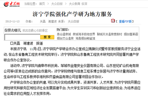 2013年11月13日,《大众日报》“纵横”栏目发表了《〈儒韵新曲〉—济宁学院文化建设侧记之二》和《济宁学院强化产学研为地方服务》,对我校文化建设和强化产学研为地方服务作了专题报道。