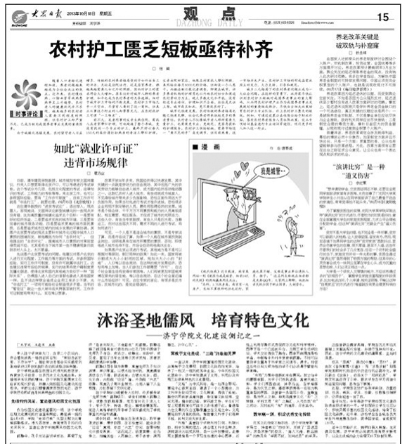 2013年10月18日,《大众日报》“观点”栏目发表了《〈沐浴圣地儒风,培育特色文化〉—济宁学院文化建设侧记之一》,对我校文化建设作了专题报道。