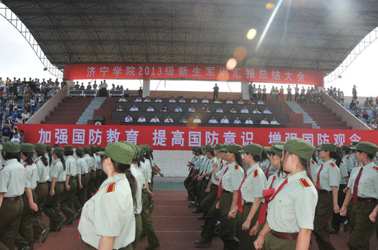 吕灵昌作总结讲话。他代表济宁学院向莅临现场指导的71770部队领导、担任军训任务的承训官兵表示热烈的欢迎和崇高的敬意!向圆满完成军训任务、取得优异成绩的2013级新同学、向获得表彰的6个先进营、7个优胜连、224名优秀学员,并对今天精彩、圆满的阅兵式展演表示热烈的祝贺!他说,中国人民解放军71770部队是一支有着光荣的革命传统和优良的军事作风的部队。在今年的军训中,通过教官精心的组织,科学的安排,严格的训练,确保了今年学校4200余名2013级新生军训工作的圆满成功。他强调,开展军训活动是新时期加强大学生德育工作的重要举措。军训阅兵式、分列式上,整齐的步伐、响亮的口号、规范的动作、昂扬的斗志,充分表现了当代青年人相信自我、挑战自我、超越自我的精神,充分展示了新时期大学生积极进取、奋发向上的精神风貌。军训时间虽然很短,但通过军训,同学们增强了国防观念和国防安全意识;提高了思想道德素质、科学文化素质和身体心理素质,为推进素质拓展教育打下了坚实基础。他希望同学们珍惜军训生活,珍藏军训收获,保持军人风采,发扬吃苦精神,坚定生活信心,增长成长勇气,学会面对困难,敢于接受挑战,做一个理想远大、热爱祖国、追求真理、勇于创新、视野开阔、胸怀宽广、知行统一、笃学力行、德才兼备、全面发展的人!以新的姿态、新的付出、新的追求、谱写人生新的篇章!以新的收获、新的奉献、新的形象,为济宁学院更好更快地发展做出更大的贡献!