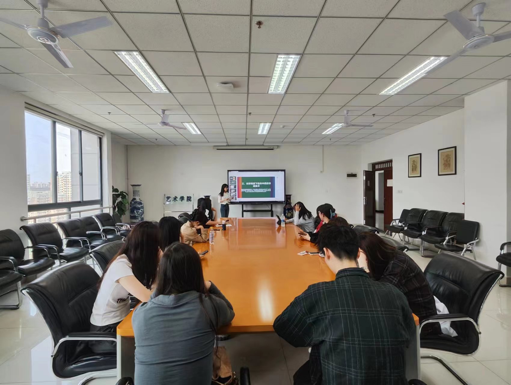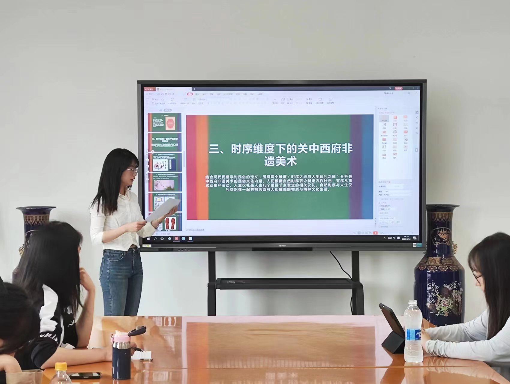 艺术学院2020级硕士研究生姚永婷和郑成霞两位同学分别以《关中西府非遗美术的民俗之维》和《高校艺术研学助力乡村振兴——以关中非遗美术为例》为题,为大家分享了所作课题的研究过程和相关成果。