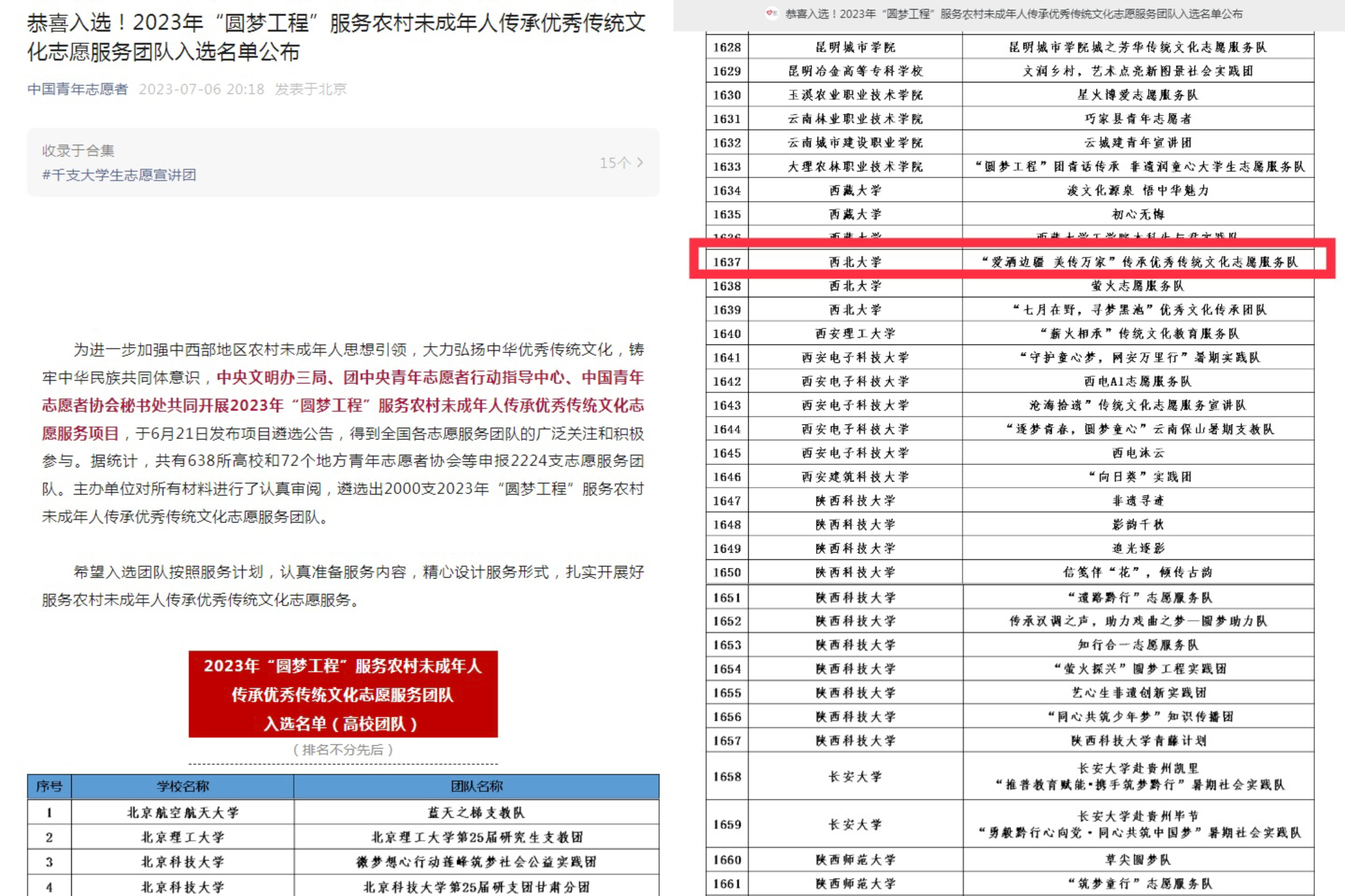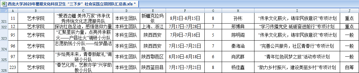 2023年,艺术学院共有6支团队顺利在学校立项,将赴新疆克拉玛依、上海、西安市鄠邑区和蓝田县等地开展实践活动。其中, “爱洒边疆 美传万家”传承优秀传统文化志愿服务队成功入选中央文明办三局、团中央青年志愿者行动指导中心、中国青年志愿者协会秘书处共同开展的2023年“圆梦工程”服务农村未成年人传承优秀传统文化志愿服务项目。