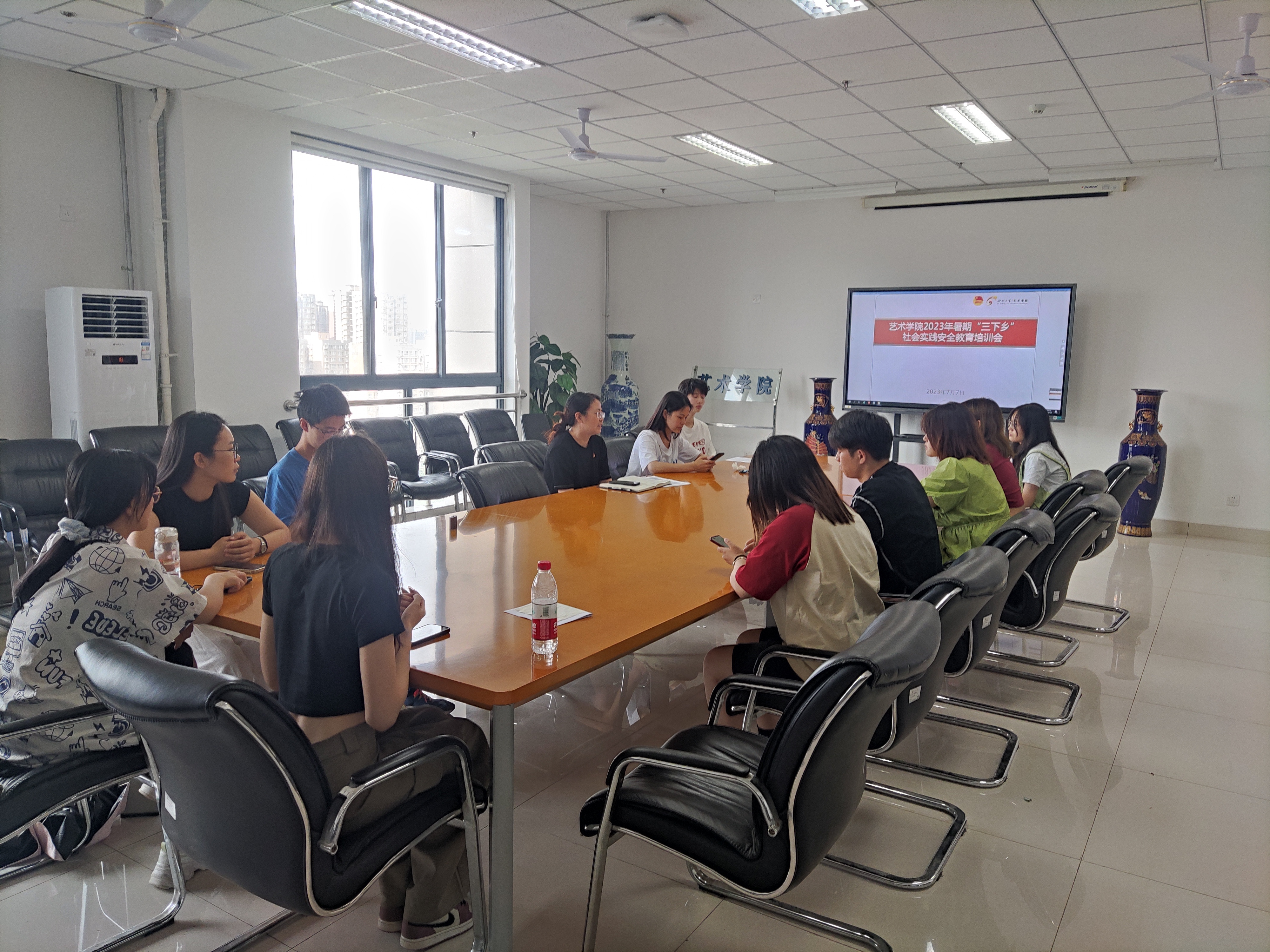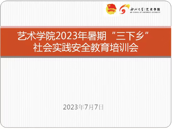 青春志愿行,奉献新时代。2023年7月7日下午,艺术学院团委在西北大学长安校区东学楼北1305会议室举行了2023年暑期“三下乡”社会实践安全教育培训会议。学院团委书记白鹤、学生兼职副书记肖武群、各社会实践队伍负责人及部分队员参加了此次培训。
