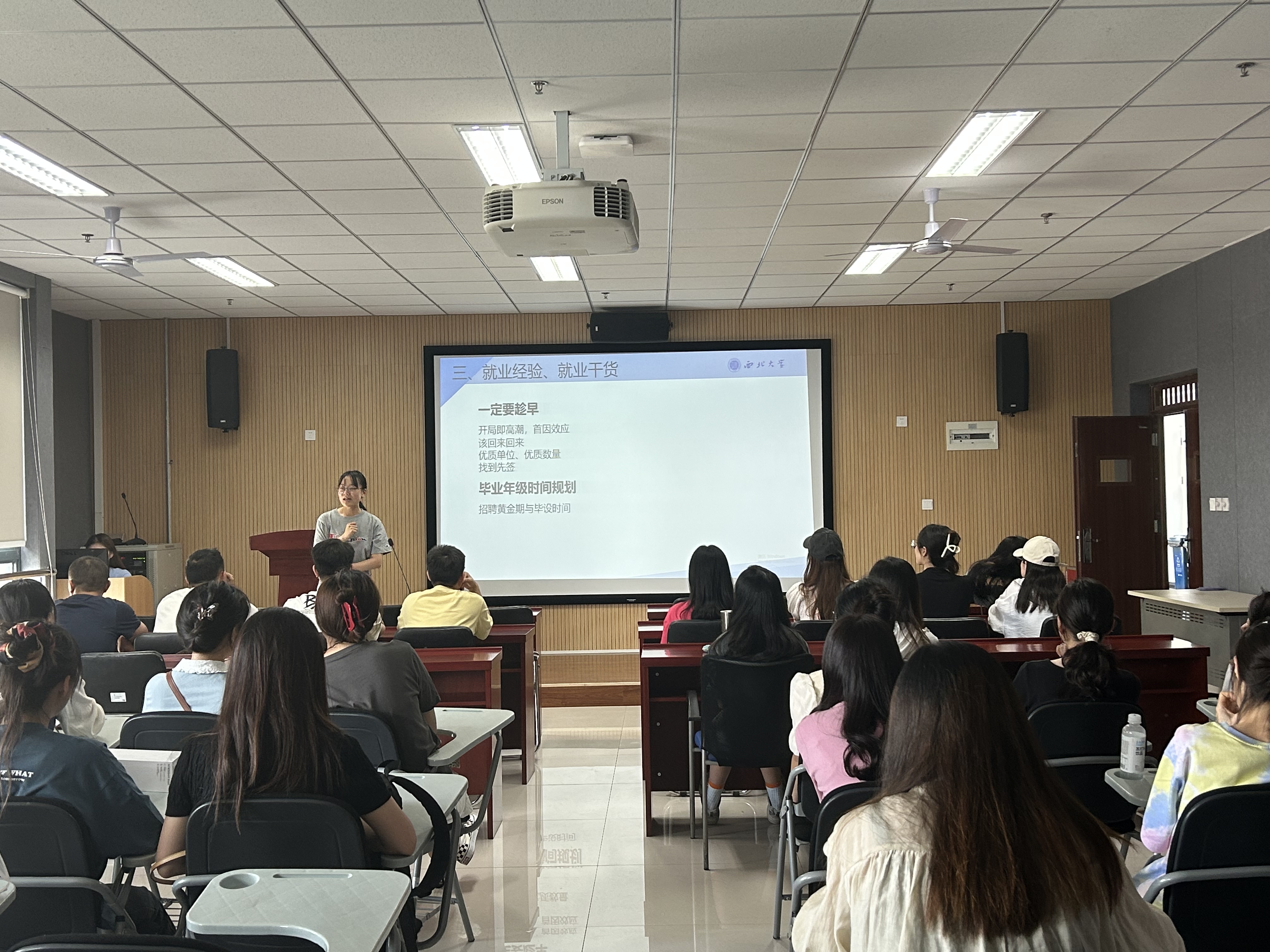 段思园老师结合毕业年级的几个重要时间节点,动员同学们做好求职的各方面准备,有效把握稍纵即逝的就业机会,积极参加校内、校外各类招聘会。强调充分认识当前的就业形势,转变就业心态,“先就业,再择业”,并就大家关心的就业问题做了详细地介绍,建议大家充分利用就业政策,主动寻求就业帮扶。