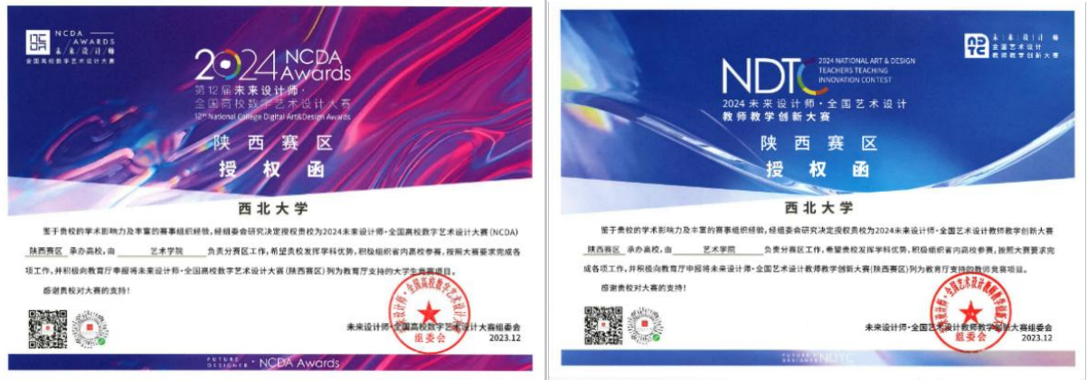 2023年12月1日,第11届未来设计教育论坛暨未来设计师∙全国高校数字艺术设计大赛(NCDA)、未来设计师∙全国艺术设计教师教学创新大赛(NDTC教创赛)颁奖典礼在上海工程技术大学圆满结束。汇聚了来自全国各地的师生代表、竞赛组织单位、合作单位及行业代表等800余人,共同探讨未来设计教育的趋势及发展,并对未来设计师的培养进行了深入交流。此次大赛中我院师生取得佳绩,同时,西北大学被授予陕西赛区的承办高校,彰显我院的学术影响力。