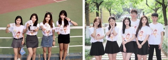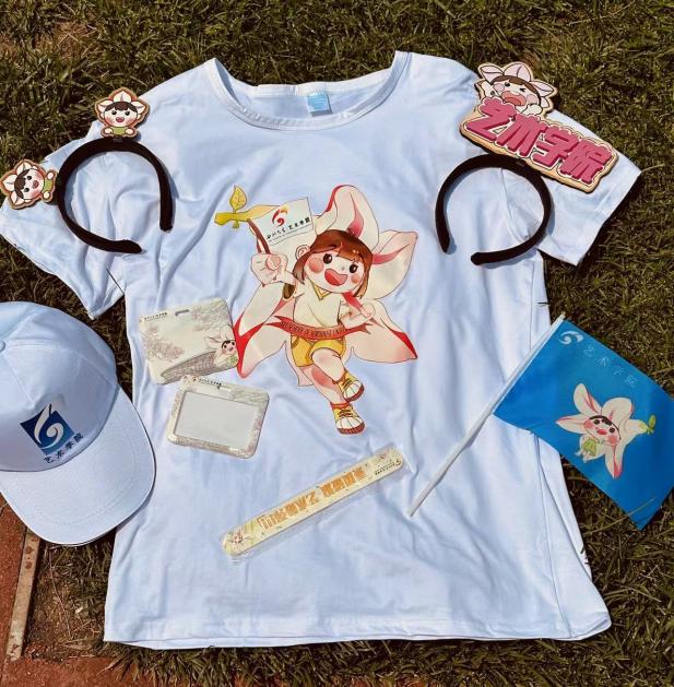 以玉兰萌宝的IP形象为设计原本,衣服以白色打底,玉兰娃娃手执艺术学院小旗子,脸上洋溢着青春活力的笑容,向前奔跑冲向终点线。设计形象动感十足,清新可爱,背后乘风破浪的字样朝气蓬勃,充分展现了学院学生们可爱纯真的青春面貌,追求卓越的精神品质。