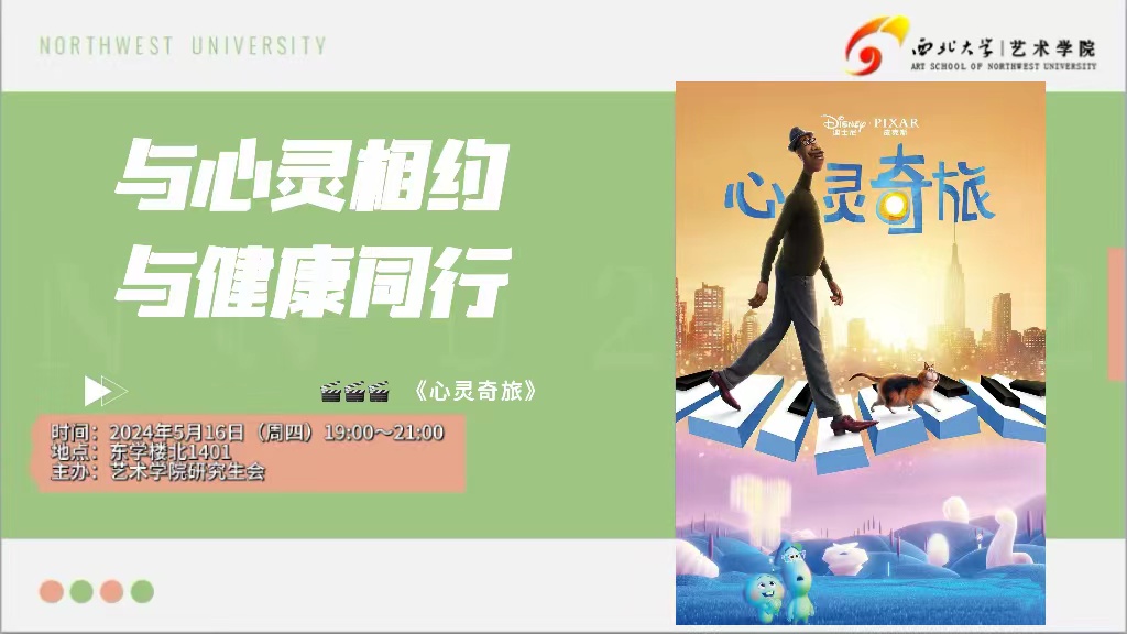 2024年5月16日晚,西北大学艺术学院研究生会于在长安校区东学楼北1401教室举办“与心灵相约,与健康同行”主题观影活动。从而,进一步贯彻落实《高等学校学生心理健康教育指导纲要》,提高大学生心理健康水平和积极心理品质,培育学生自尊自信、理性平和、积极向上的健康心态。