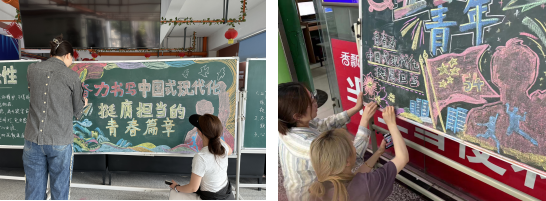 我宣传我行动共建美好新家园——庆祝“五四青年节”一站式社区专题黑板报宣传志愿服务。2024年4月28日至5月2日,学院组织多名志愿者协助楼管阿姨,在14号、16号及硕博宿舍楼绘制“学习习近平总书记五四寄语精神”主题黑板报,做好一站式社区楼宇宣传工作。小画笔传播正能量,一方面,通过黑板报宣传,鼓励广大团员青年传承与弘扬五四精神,增强当代青年的使命感、责任感;另一方面,通过发挥专业特长,也激发着艺术学院青年志愿者们的创造力,展现他们对五四精神的独特理解和实践,共同绘制出新时代青年的绚丽篇章。
