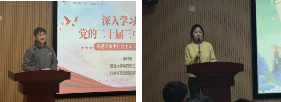 2024年12月4日晚,艺术学院团委特别邀请西北大学马克思主义学院“红桅杆”思政理论学习社团于长安校区东学楼北1401开展党的二十届三中全会精神宣讲。宣讲会由学院团委学生兼职副书记蔡家瑞同学主持。