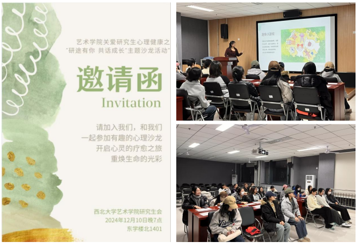 2024年12月10日晚,艺术学院研究生会在东学楼北1401教室举办了关爱研究生心理健康之“研途有你 共话成长”主题沙龙活动,进一步宣传心理知识,认识并接纳自己,引导大家保持健康心态,提高心理素质,营造良好的校园文化氛围。活动由院研究生会心理部负责人周怡君同学主持。