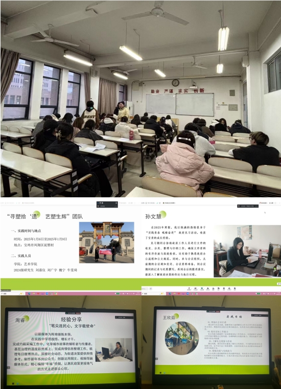 实践归来话成长,总结分享促新知。2024年3月7日至14日,艺术学院团委积极开展2025年寒假社会实践经验总结分享会,20支团队和43名政府见习学生利用学院学生干部座谈会、研究生会团支部团日活动以及各专业团支部会议先后进行了24场分享活动。大家围绕各自实践内容,向学院本硕600余人介绍了活动前期、中期、后期具体开展情况,使同学们对社会实践活动有了更明晰地认知,同时也不断地鼓励动员广大同学积极参与。