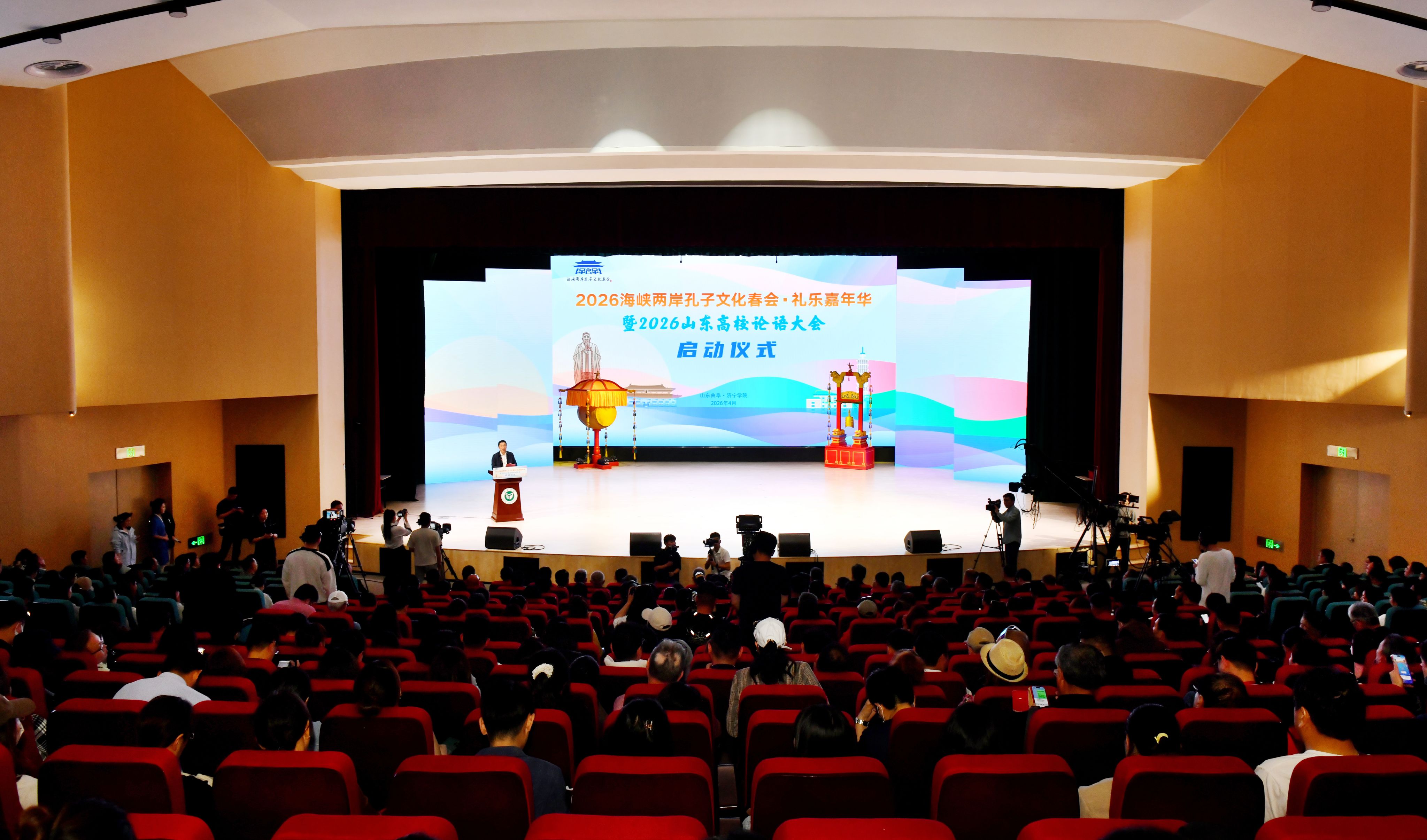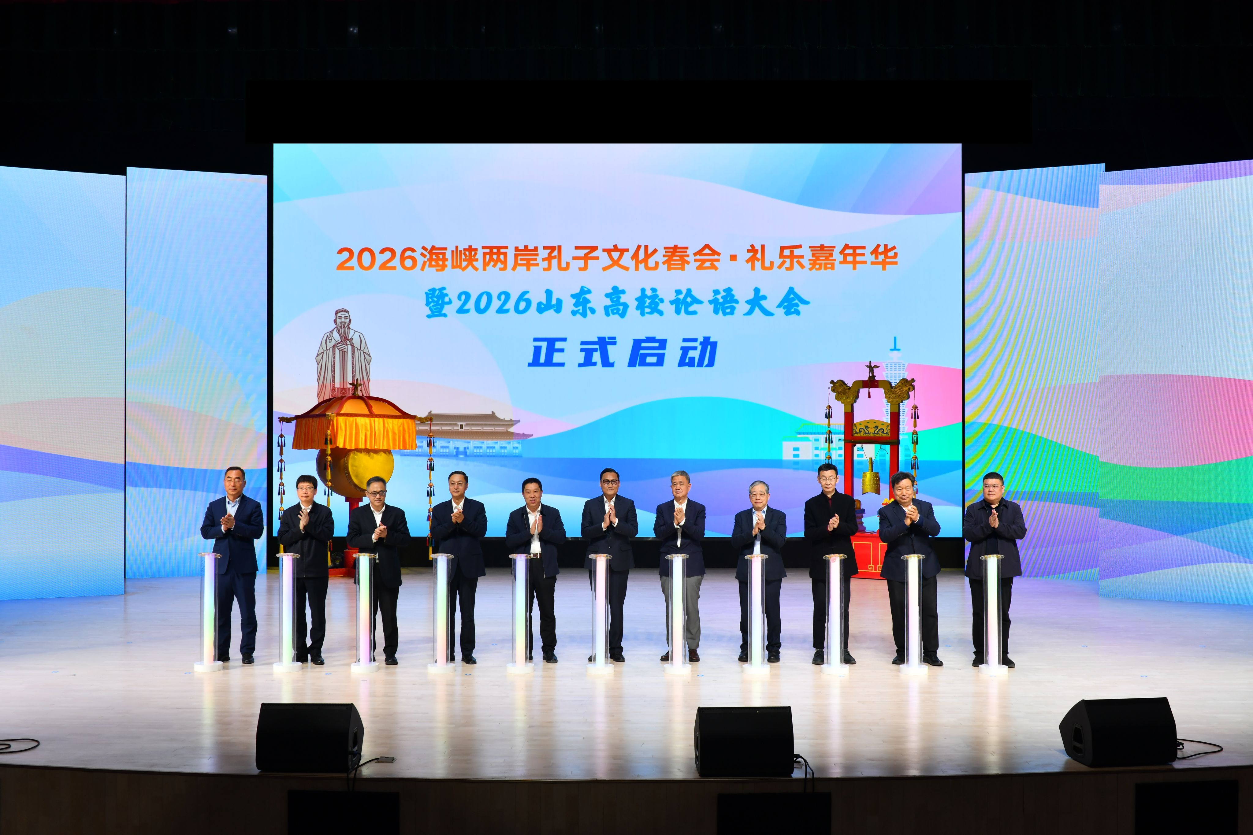 4月1日下午,2026海峡两岸孔子文化春会礼乐嘉年华暨2026山东高校论语大会启动仪式在济宁学院隆重举行。孔子第79代嫡长孙、至圣孔子基金会会长、济宁学院名誉校长孔垂长,至圣孔子基金会执行长陈泰旭,尼山世界儒学中心(中国孔子基金会秘书处)党委委员、副主任刘皓,北京师范大学中国公益研究院院长王振耀,台湾东吴大学教授李克明,台北市立大学教授张晓生,济宁学院党委书记仲红波,党委副书记、校长王清明,山东教育电视台党委委员、副台长陈本刚,曲阜文化建设示范区党工委副书记、推进办主任朱湘华,济宁广播电视台党组副书记、总编辑尚朋,济宁银行党委委员、副行长刘志刚,我校领导丰家雷、赵明、孔繁润、张永强、刘克非出席活动,学校各单位部门负责人、师生代表以及200余位台湾嘉宾应邀参与此次盛会。
