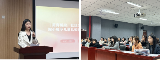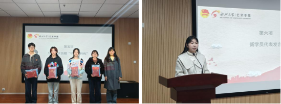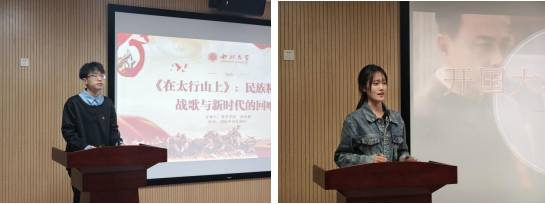 哲学学院孙庆彬同学以《<在太行山上>:民族精神的战歌与新时代的回响》为题,从《在太行山上》这一艺术作品的历史背景、创作历程、精神传承等多维度展开,引领同学们感受红色经典的魅力,从中汲取奋进前行的力量;新闻传播学院李昱函同学以《开国大典上的声音——走近齐越》为题,生动讲述了杰出校友、新中国广播事业奠基者齐越在开国大典上向全世界播报的历史性时刻,再现了那个庄严激昂的声音如何传遍中国、震撼世界。通过齐越“播音三戒”的职业信条,诠释其严谨求精、为人民发声的崇高精神;艺术学院杨雯婷同学以《美育桥梁:社区志愿美术教育对缩小城乡儿童认知差距的实践探索》为题,结合自身志愿服务经历,通过生动的课堂案例和数据对比,展示了美育在提升儿童语言能力、想象力与自信心方面的显著成效,并呼吁青年学子以实际行动助力教育均衡发展。