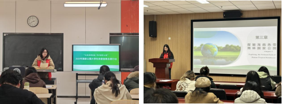 11月12日下午、13日晚、14日下午,团队先后面向艺术学院第七期青马班、入团积极分子和2025级本科生,开展主题宣讲三场。宣讲会上,团队负责人谢祖晓同学首先介绍团队组建背景与工作愿景,随后郭子玉等6名队员以详实的内容、鲜活的案例,图文并茂、生动讲解国家公园建设的生态意义、生物多样性保护成果及生态文明建设的重要性,让同学们深切感受到守护绿水青山的责任。从政策解读到实践引导,每场宣讲都收获了满满认可。