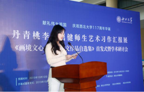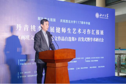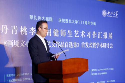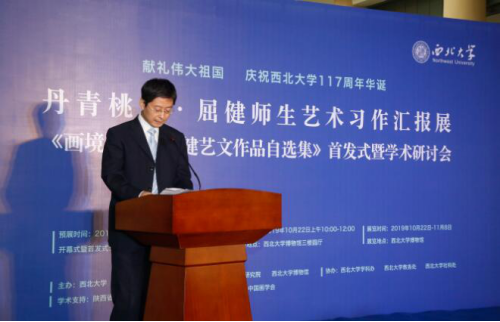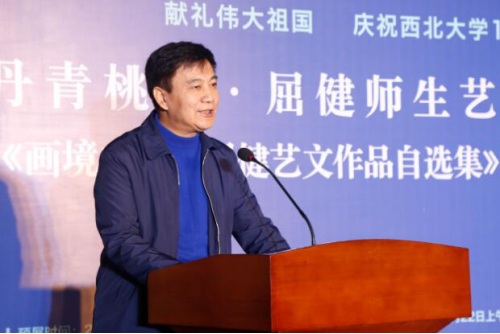 2019年10月22日上午9点,献礼伟大祖国,庆祝西北大学117周年华诞“丹青桃李·屈健师生艺术习作汇报展”、《画境文心·屈健艺文作品自选集》首发式暨学术研讨会在西北大学博物馆隆重开幕。省政协副主席刘宽忍、省人大原副主任邓理、省委组织部原副部长田晓东、省民政厅原常务副厅长郭青凡、西安美院原党委书记朱恪孝、光明日报陕西记者站站长张哲浩、省美协主席郭线庐、省评协主席李震、西北大学党委书记王亚杰、西北大学校长郭立宏等来自省内外的专家学者及艺术爱好者300余人参观了开幕式及首发式活动。开幕式由西北大学副校长奚家米主持。