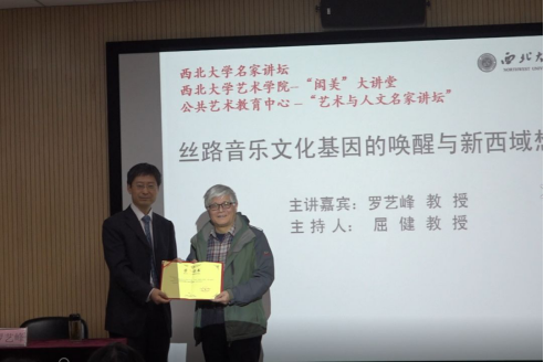 10月17日上午,我校艺术学院及公共艺术教育中心举办的首届西北大学美育活动月之《丝路音乐文化基因的唤醒与新西域想象》专题讲座在长安校区举行。本场讲座系西北大学名家讲坛、艺术学院闳美大讲堂及公共艺术教育中心艺术与人文名家讲坛之一,由著名艺术史家、音乐学家罗艺峰先生应邀做了专题报告。讲座开始前,罗艺峰教授在艺术学院院长屈健、院党委书记吕健的陪同下参观了艺术学院的学生作品展。艺术学院院长屈健主持讲座。