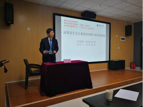罗艺峰教授主要围绕丝绸之路音乐的文化传统、历史走向、当代复兴三个方面做了全面梳理,并结合国家“一带一路”倡议定位、“人类命运共同体”的理论内涵,高度阐释了丝路艺术文化的发展动向。他指出:“形成于两汉时期的丝绸之路,不仅是东西方商贸交易之路,更是中国和亚欧各国政治、文化、艺术交流的通道。”“丝绸之路对中国艺术史影响极深,音乐里留下了一些文化基因,这些文化基因显示了那个时代中国人的地理想象、家国想象、艺术想象。”他强调:“‘一带一路’的战略规划在文化上更是一个文化酵母,21世纪中国的文化建设和发展,将与这一主题发生深刻关联,构成了新时代丝路艺术的文化基因,一方面唤醒了古老丝路的传统基因,一方面形成了新的文化创造动力,带来了新西域想象的新内涵——即‘地理空间想象’‘历史时间想象’‘多民族文化想象’——一同构成了人类共同体想象”。在提问环节,同学们踊跃发言,围绕丝路艺术的继承与创新,专题研究的方法与策略等相关问题展开积极讨论。