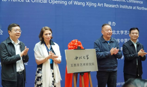 开幕式结束后,法国秋季沙龙主席谢尔维亚,陕西省原副省长、省决策咨询委员会副主任白阿莹,陕西省第十届人大常委会副主任邓理,西北大学党委书记王亚杰为西北大学王西京艺术研究院揭牌。