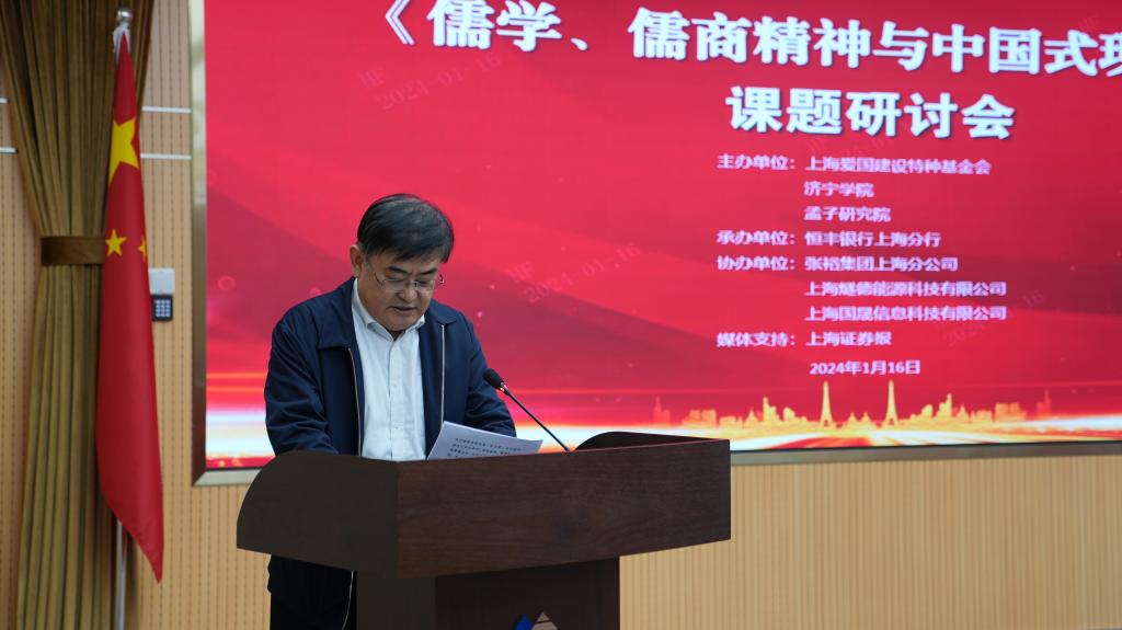 为持续推进“儒学·儒商精神与中国式现代化”课题研究。1月16日,《儒学·儒商精神与中国式现代化》第六次研讨会在上海举行。我校党委副书记丰家雷出席会议并致辞,济宁市十七届人大常委会副主任陈国华出席并主持会议。上海爱国建设特种基金会理事长、爱建集团党委书记、监事长范永进,上海证券报党委书记、董事长叶国标,世界孔子后裔联谊总会副会长、曲阜孔子书院执行院长孔众等出席会议并发言。