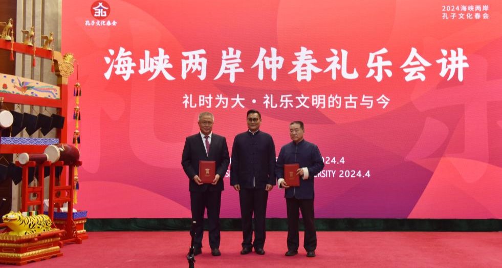 4月2日下午,2024海峡两岸孔子文化春会仲春礼乐会讲在济宁学院举行。孔子第79代嫡长孙、至圣孔子基金会会长、济宁学院名誉校长孔垂长,省政府台湾事务办公室主任张连三,省政协港澳台侨和外事委员会主任周云平,省政府台湾事务办公室副主任王清玉,尼山世界儒学中心党委委员、副主任刘皓,济宁学院党委书记杨天梅,党委副书记、校长王清明,党委委员、副校长赵明、副校长刘国栋出席活动。仪式由济宁学院党委副书记丰家雷主持。