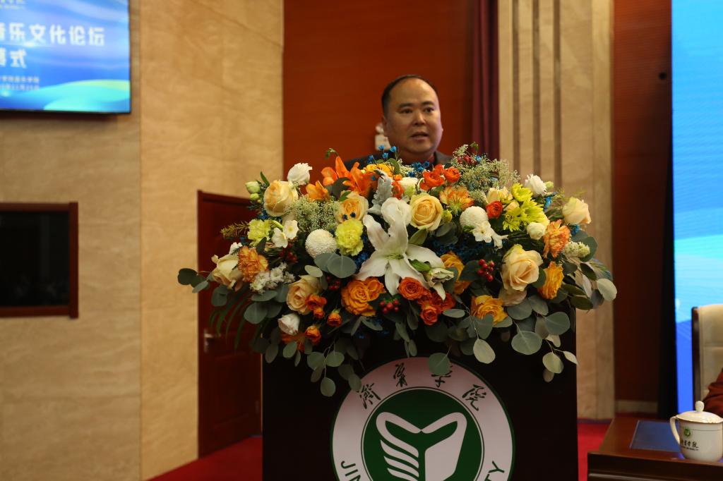 刘国栋在开幕式上讲话,他代表济宁学院向全国各地远道而来的各位领导专家们,以及到会的各位学术人才表示了热烈的欢迎,他介绍了孔子故里、国家历史文化名城——曲阜以及济宁学院的发展方向,并指出学校始终坚持开放办学,积极对接国家“一带一路”倡议,先后与俄罗斯、乌克兰、泰国、菲律宾等国家以及中国台湾地区的40余所高校和科研机构在教师互派、学分互认以及留学生培养等方面开展了多形式、深层次、宽领域的合作交流,学校的国际化办学水平稳步提升。他希望借此次论坛,筑巢引凤,吸引全球音乐文化研究人才前来建言献策,充分发挥论坛的作用,为大家答疑解惑,探索中华传统音乐文化研究,进一步推动中华音乐文化在当代音乐社会中创造性转化和创新性发展的新高度。