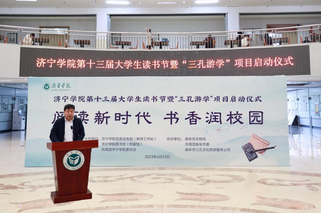 阅读新时代,书香润校园。4月23日上午,在世界读书日来临之际,济宁学院第十三届大学生读书节暨“三孔游学”项目启动仪式在图书馆二楼大厅举行。校党委副书记、校长王清明出席启动仪式并讲话,党委委员、副校长尹春光、赵明,党委委员、宣传部部长刘克非,共青团曲阜市委书记马汉卿,曲阜市文物局副局长韩凤举,曲阜市三孔文化旅游服务公司董事长颜涛出席活动。学校相关部门负责人、二级学院团委书记、学生代表参加活动。启动仪式由赵明主持。