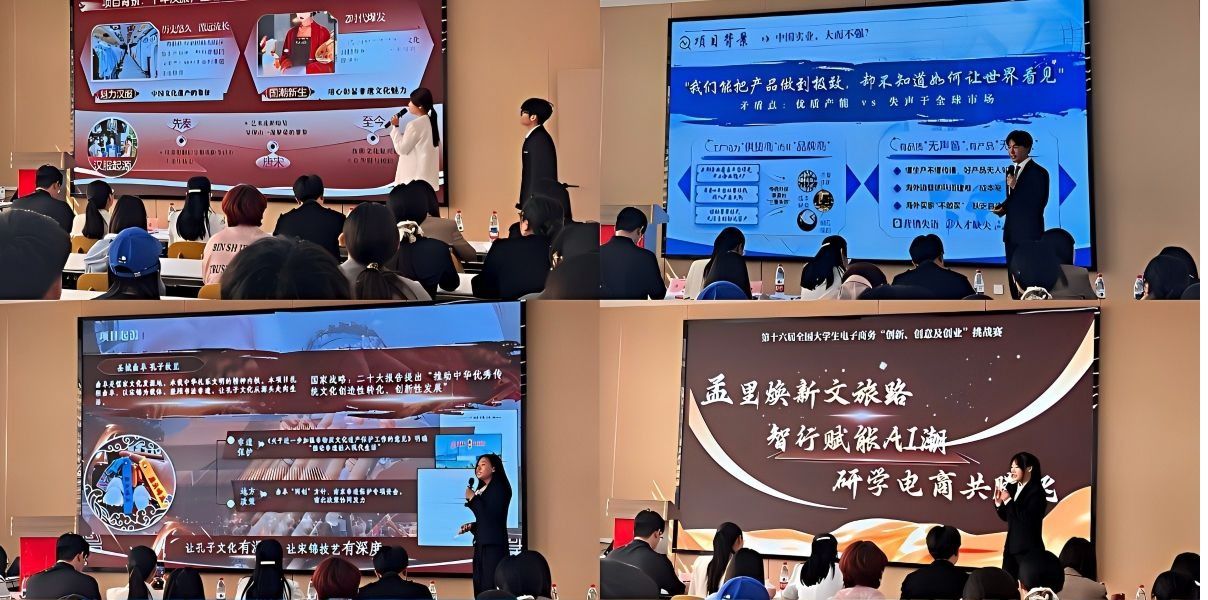 自去年10月启动以来,本届校赛吸引了来自全校各学院的2162名学生、共460支团队报名参赛。经过初赛和小组赛的激烈角逐,多支优秀团队脱颖而出。参赛项目紧扣社会热点,聚焦市场前沿,围绕项目背景、竞争优势、现有成果及未来规划进行了深入剖析,涵盖了乡村振兴、文化创意、非遗传承、社群电商、跨境电商、商务数据分析等多个领域,充分展现了学生扎实的专业素养、敏锐的市场洞察力与出色的创新能力。