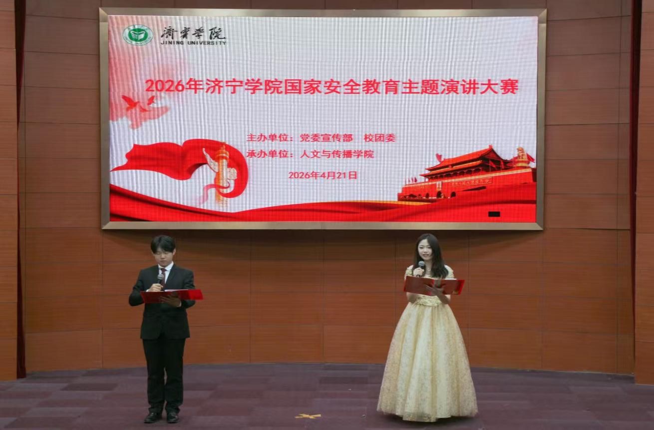 4月21日晚,由学校党委宣传部、团委主办,人文与传播学院承办的“2026年济宁学院国家安全教育主题演讲大赛”决赛在九号楼报告厅举行。党委宣传部、团委、人文与传播学院等单位部门相关负责人出席活动。