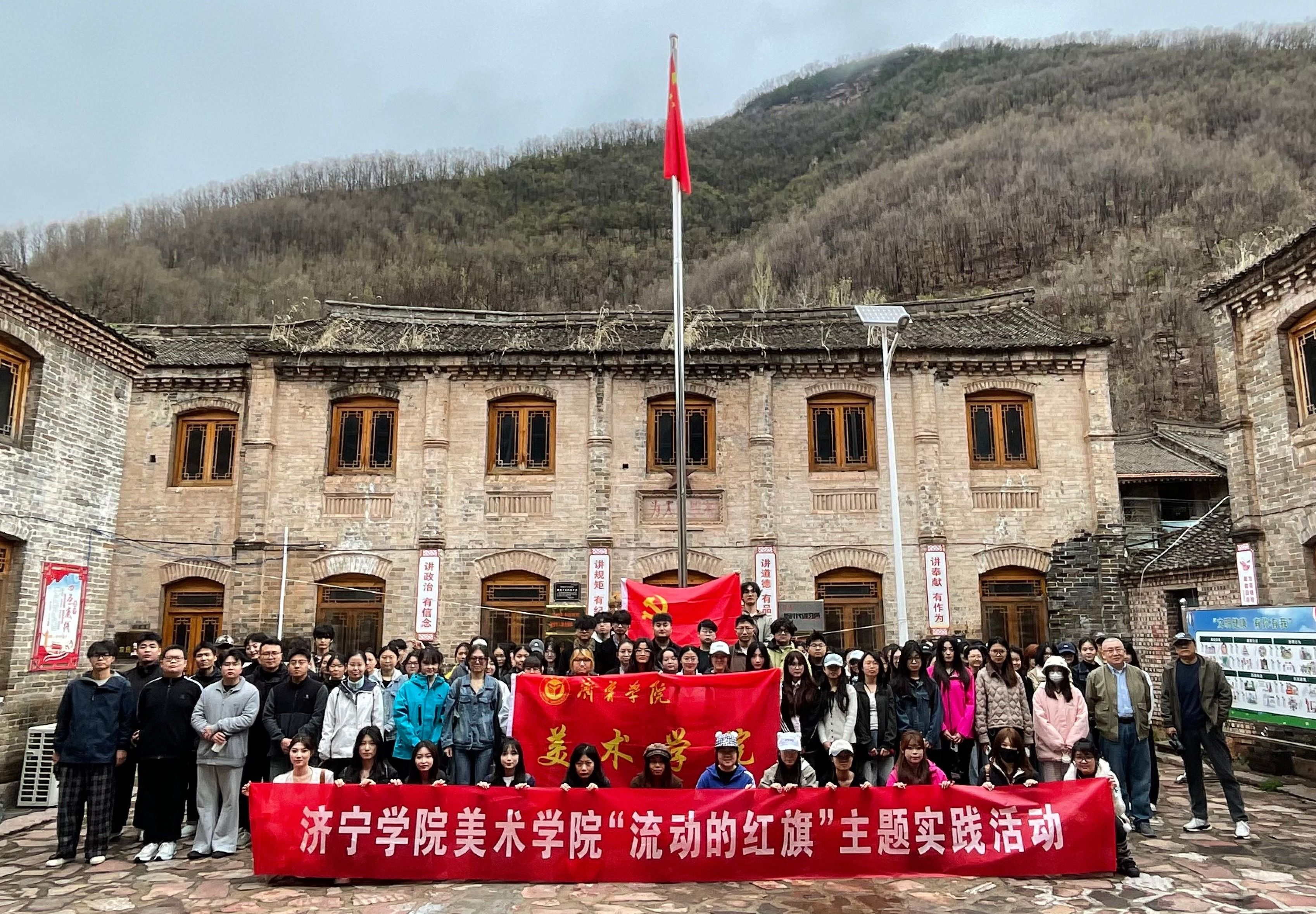 师生以太行风光、古村风貌为素材,开展山水画、油画写生创作,锤炼专业技能。课程还将红色教育与地域文化传承贯穿其中:赴天宫王府、砥洎城进行文化考察;赴八路军次滩兵站旧址、太岳支队十三烈士纪念亭开展“流动的红旗”主题实践活动,通过瞻仰革命旧址、聆听英雄事迹,传承红色基因、厚植爱国情怀,强化“行走的思政”育人实效。全体学生以饱满热情投入活动,将专业实践与红色初心深度融合,切实提升了专业素养与思想认识。