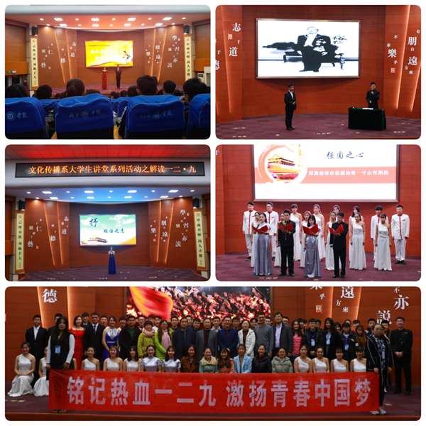 12月9日晚,由校团委、文化传播系主办,文化传播系团总支承办的大学生讲堂开讲。首场活动以“铭记热血一二·九,激扬青春中国梦”为主题,旨在纪念“一二·九”运动81周年,激励学生爱国热忱,培养学生历史责任感和使命感,弘扬爱国主义精神。学工处、校团委、文化传播系相关负责人和300余名师生共同参加了此次活动。